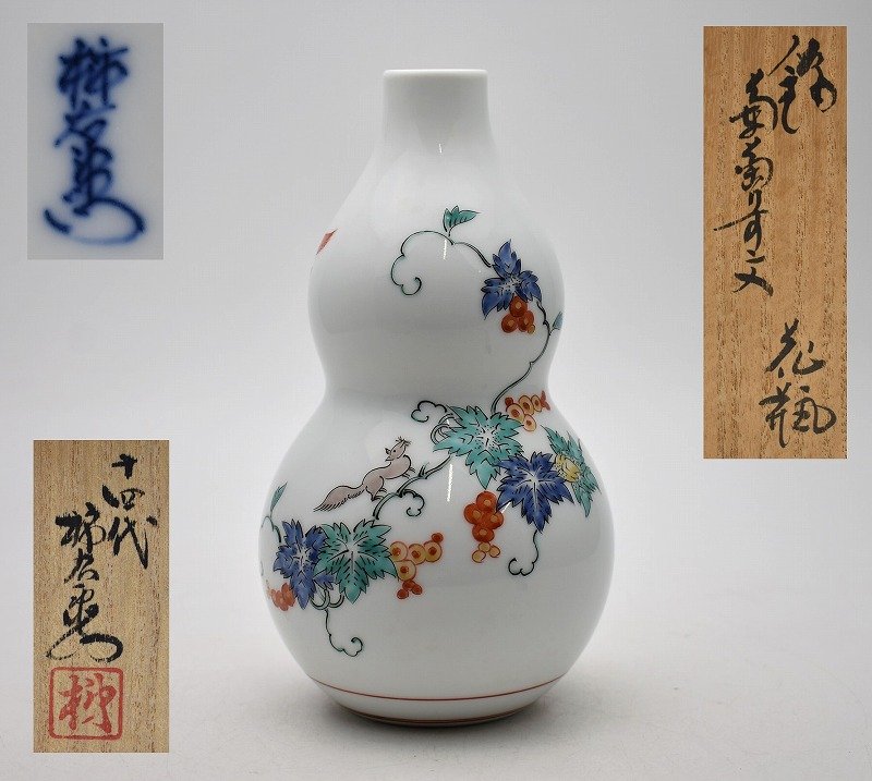 【石川県金沢市】のお客様より◆人間国宝 十四代 酒井田柿右衛門 錦 葡萄りす文 瓢形 花瓶◆をお買取り。