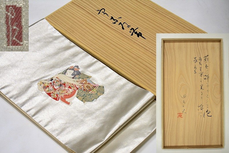 石川県金沢市のお客様に出張買取にてご依頼頂き、加賀友禅の巨匠 人間国宝 初代 由水十久 八重垣姫図 瀞銀錦 袋帯を買取りさせていただきました。