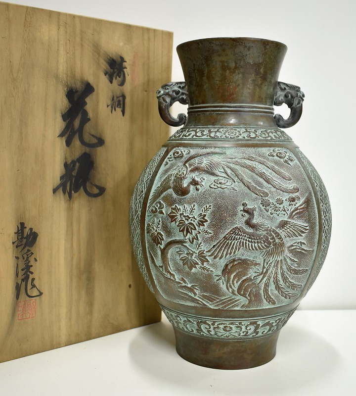石川県金沢市のお客様より出張買取にてご依頼を頂き、鋳物師 般若勘渓 花鳥図 鋳銅 銅器 獣耳付 花器 花瓶 壷を買取りさせていただきました。