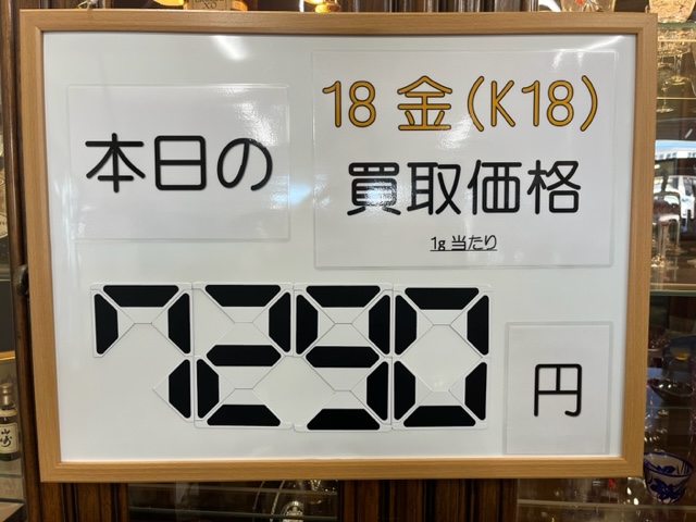 本日の【18金(K18)】1g当たりの店頭買取価格です。