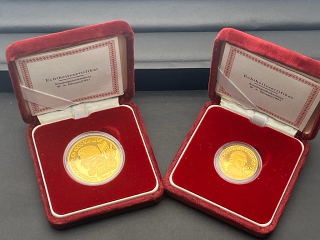 石川県羽咋市のお客様に出張買取にてご依頼頂き、1991年 モーツァルト 没後200年記念 金貨を買取りさせて頂きました。オーストリア 1000シリング  16.23g/500シリング 8.0g K23(986)