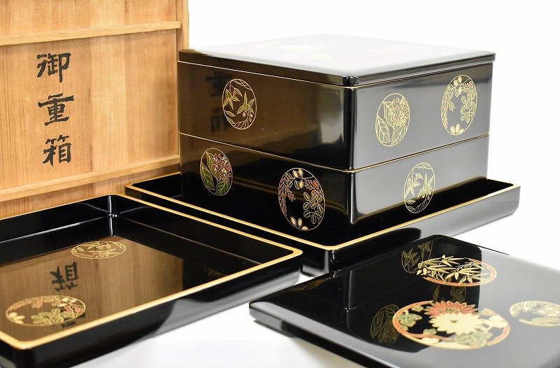 石川県金沢市のお客様に店頭買取にてご来店頂き、木製漆器 丸紋 御重箱 二段重 重台付を買取りさせていただきました。