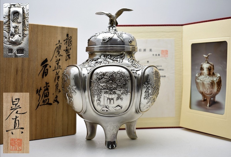 富山県高岡市のお客様より出張買取にてご依頼頂き、銀製 松浦晃 晃真 鷹蓋花鳥文 大型 香炉を買取りさせていただきました。