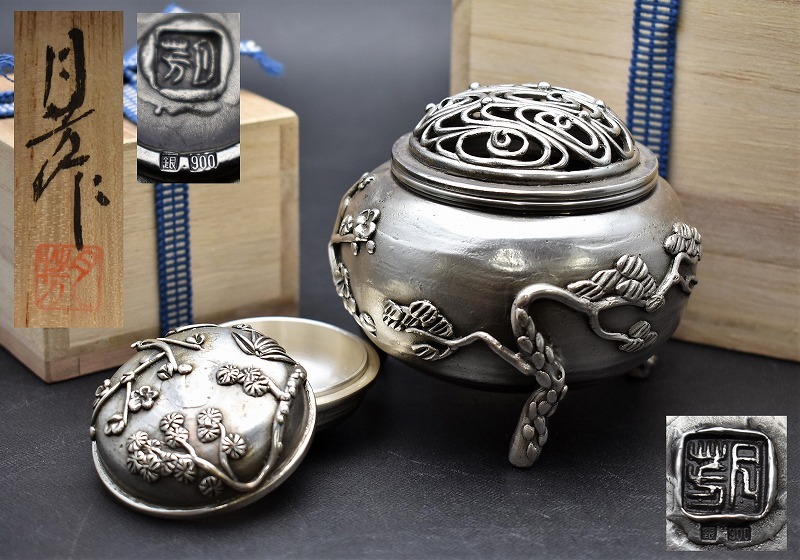 古道具買取【富山県高岡市】のお客様より◆高岡銅器 蝋型原型師 須賀月芳 銀製 松竹梅 三友図 香炉と香合◆をお買取り。