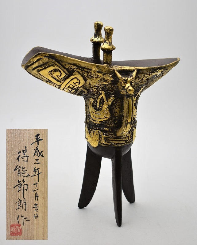 富山県高岡市のお客様より出張買取にてご依頼頂き、得能節朗作 銅器 饕餮文 三足 獣把手 爵杯を買取りさせていただきました。
