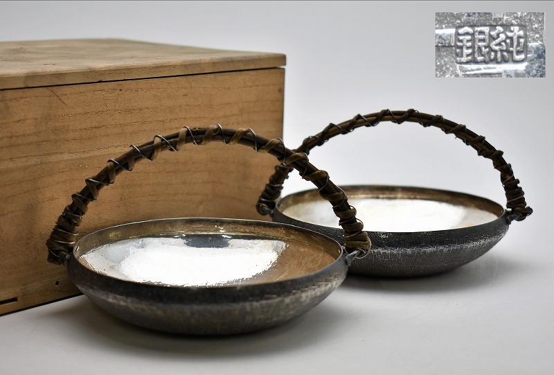 中国美術買取【石川県加賀市】のお客様より◆純銀製 手付盆 菓子盆 菓子器 果物 一対◆をお買取り。