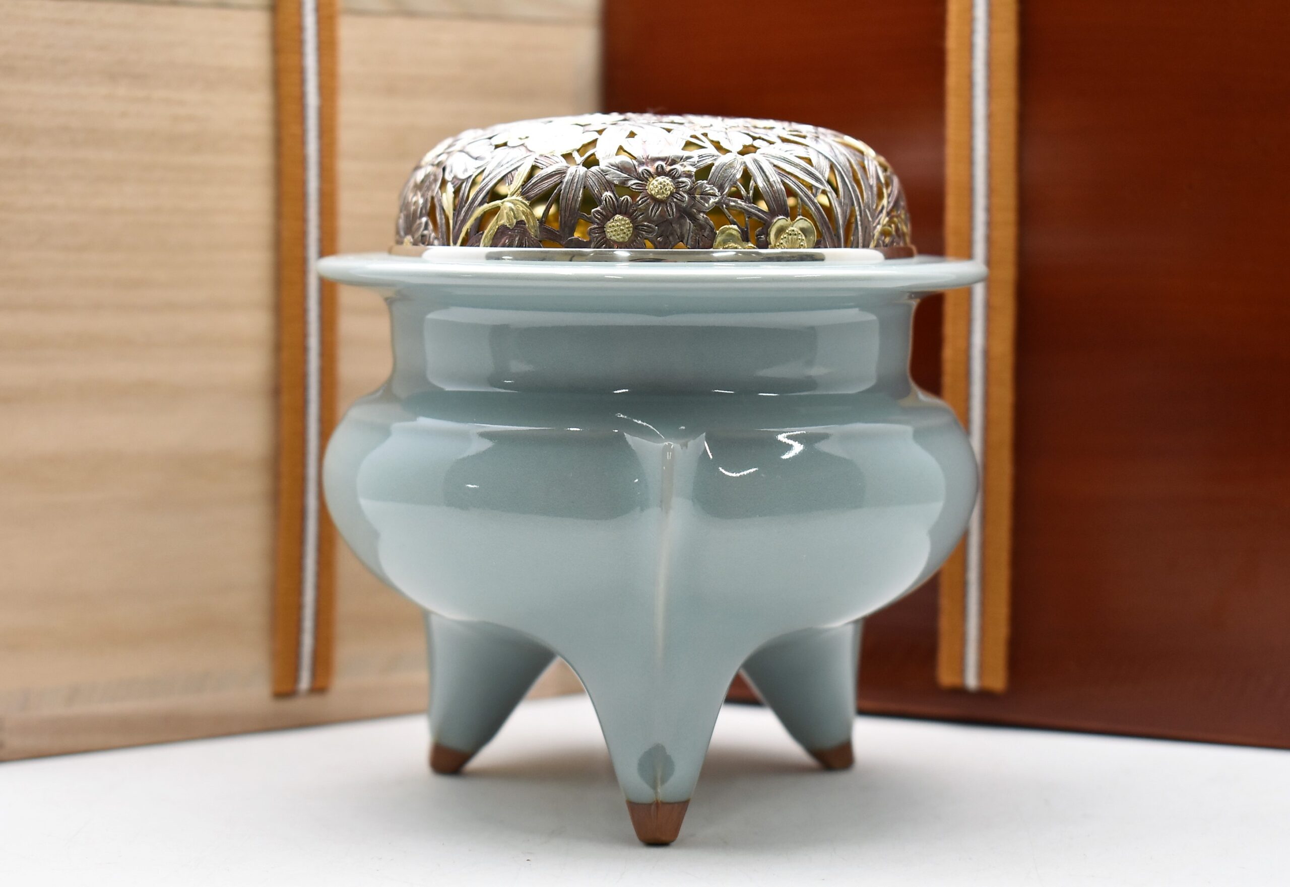 中国美術買取【福井県福井市】のお客様より◆諏訪蘇山 松興堂四君子透彫刻純銀火舎 青瓷袴腰香炉◆をお買取り。