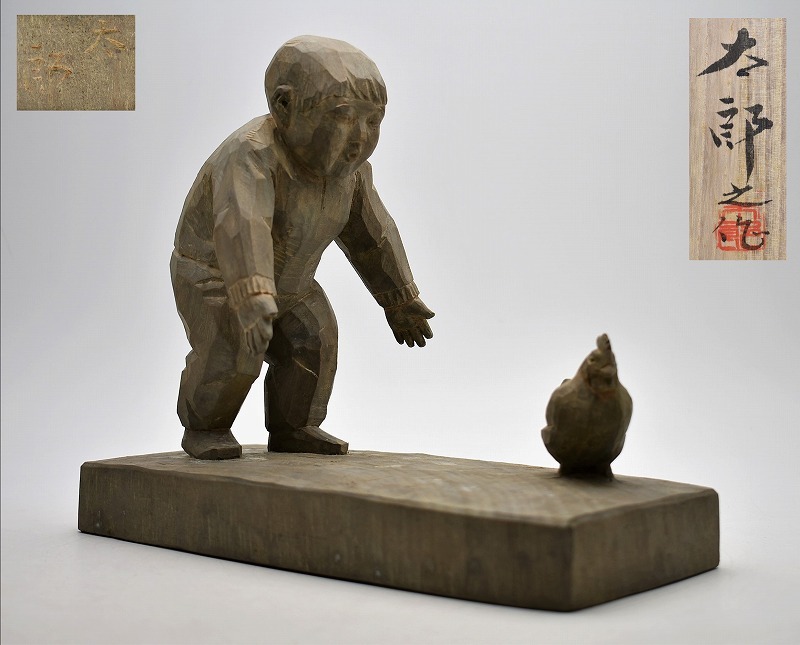アンティーク買取【石川県金沢市】のお客様より◆彫刻家 田中太郎 木彫 鶏と遊 木像 置物◆をお買取り。