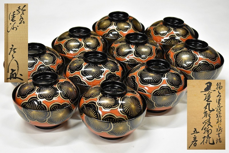 石川県七尾市のお客様より出張買取にてご依頼頂き、輪島塗 布着堅地漆器 大崎庄右衛門 蒔絵ねじ梅 黒塗丸形 吸物椀を買取りさせていただきました。