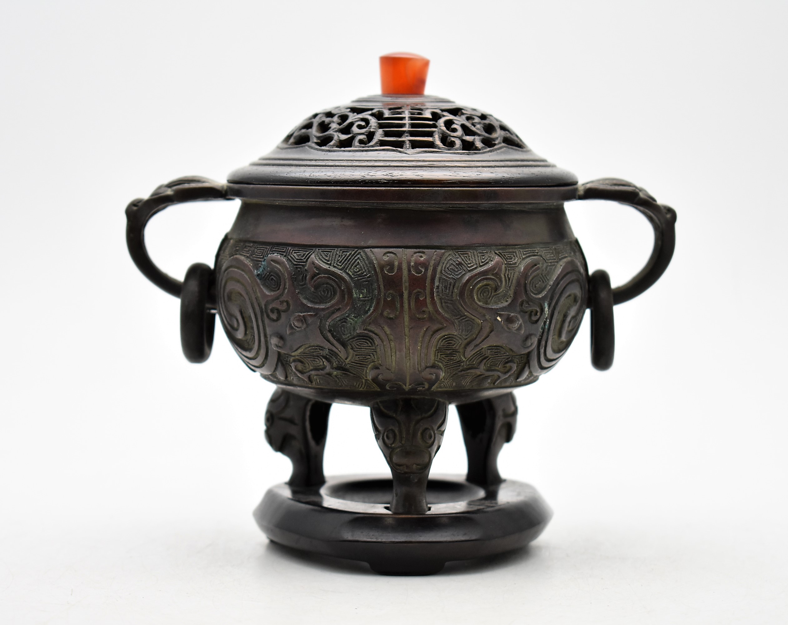 中国美術買取【石川県加賀市】お客様より◆瑪瑙摘唐木蓋 古銅獣紋耳付三ツ足香炉◆をお買取り。