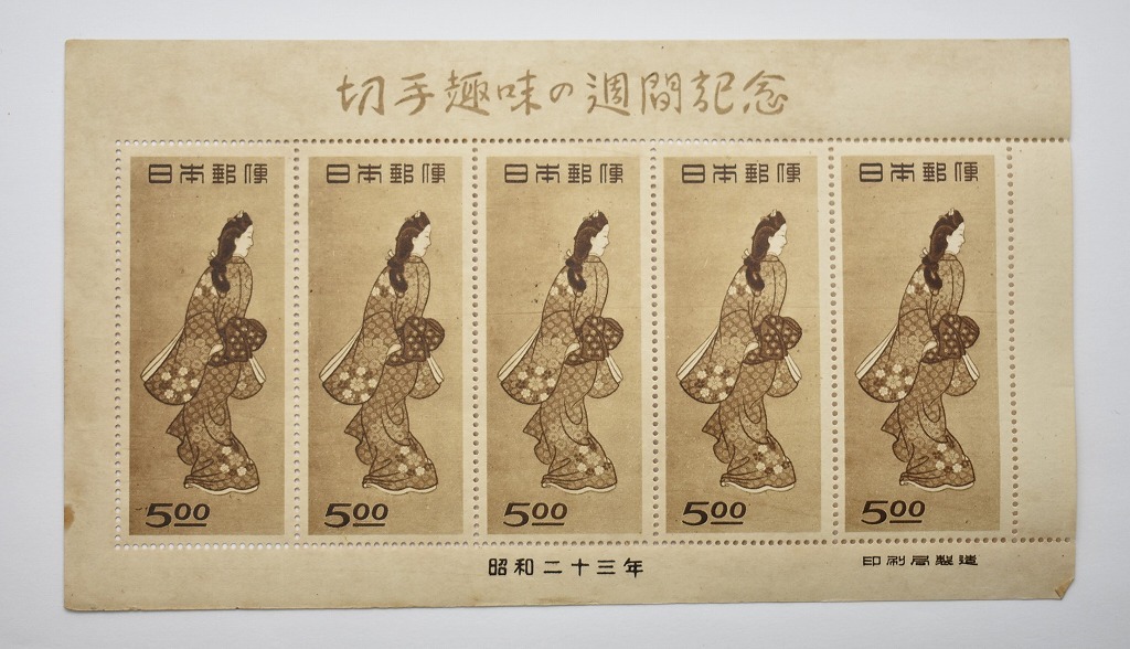 石川県金沢市のお客様より店舗持込にてご来店くださり、未使用切手 見返り美人 切手趣味の週間記念 500円×5枚を買取りさせていただきました。