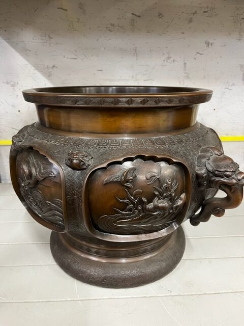福井県鯖江市のお客様に出張買取にてご依頼頂き、宣徳銅製 花鳥図 大型重厚 獣耳火鉢を買取りさせて頂きました。