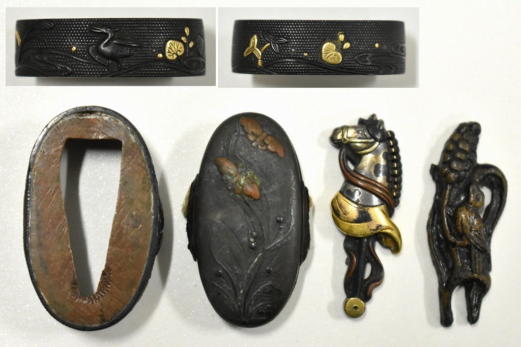 福井県鯖江市のお客様に出張買取にてご依頼頂き、時代 刀装具 武具 拵え 縁 頭 目貫 花鳥象嵌 蝶象嵌 馬図 鳥図を買取りさせて頂きました。