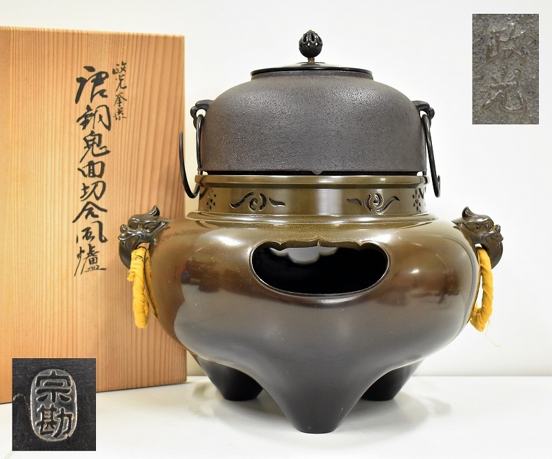 富山県小矢部市のお客様より出張買取にてご依頼頂き、釜師 菊池政光 政光釜添 鉄釜 風炉師 般若宗勘 唐銅鬼面切合風炉を買取りさせていただきました。