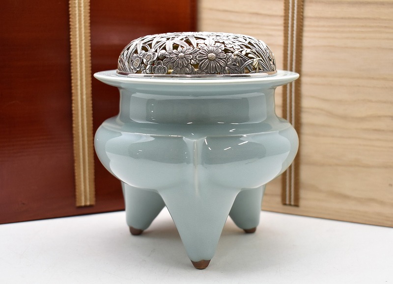 未使用美品。二重箱共箱あり。信幸造 香道具 青磁袴腰香爐 純銀刻