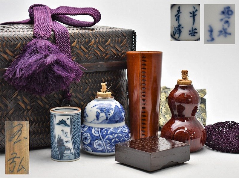 石川県金沢市のお客様に出張買取にてご依頼頂き、茶道具 国弘作 御所籠 竹編 茶箱 染付 瓢形振出 平安青峰 茶籠を買取りさせて頂きました。