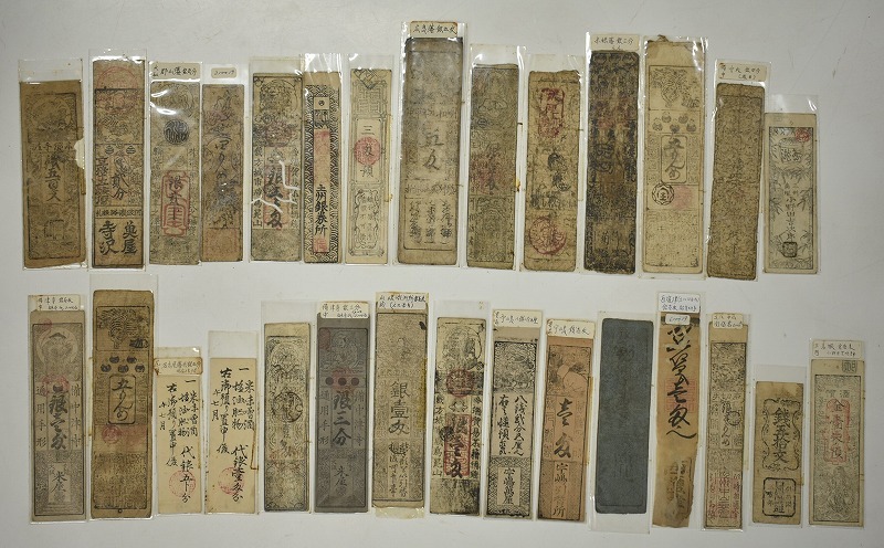石川県金沢市のお客様より出張買取にてご依頼頂き、古札 藩札 名古屋藩代銀五分 小野田吉次郎 金壹朱預 赤穂藩 銀三分 土州銀券所 広島藩 通用手形 他を買取りさせていただきました。
