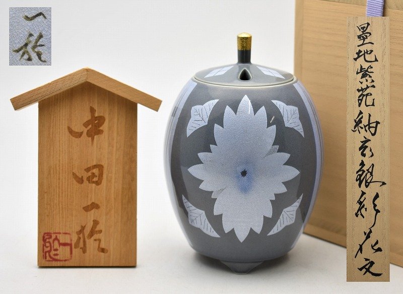 九谷焼買取 骨董品買取【福井県福井市】のお客様より◆石川県無形文化財 名工 中田一於 墨地紫苑釉裏銀彩花文 香炉◆をお買取り。