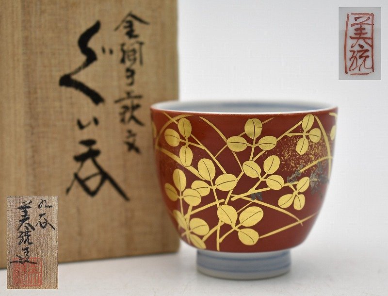 九谷焼買取 骨董品買取【石川県加賀市】のお客様より◆人間国宝 九谷焼 錦山窯 三代 吉田美統 金襴手花唐草文 ぐい呑◆をお買取り。