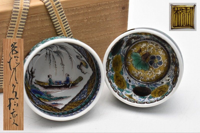 一対 共箱あり。 酒器 菊花紋 人物図懐石道具 九谷焼買取 アンティーク買取 古道具買取