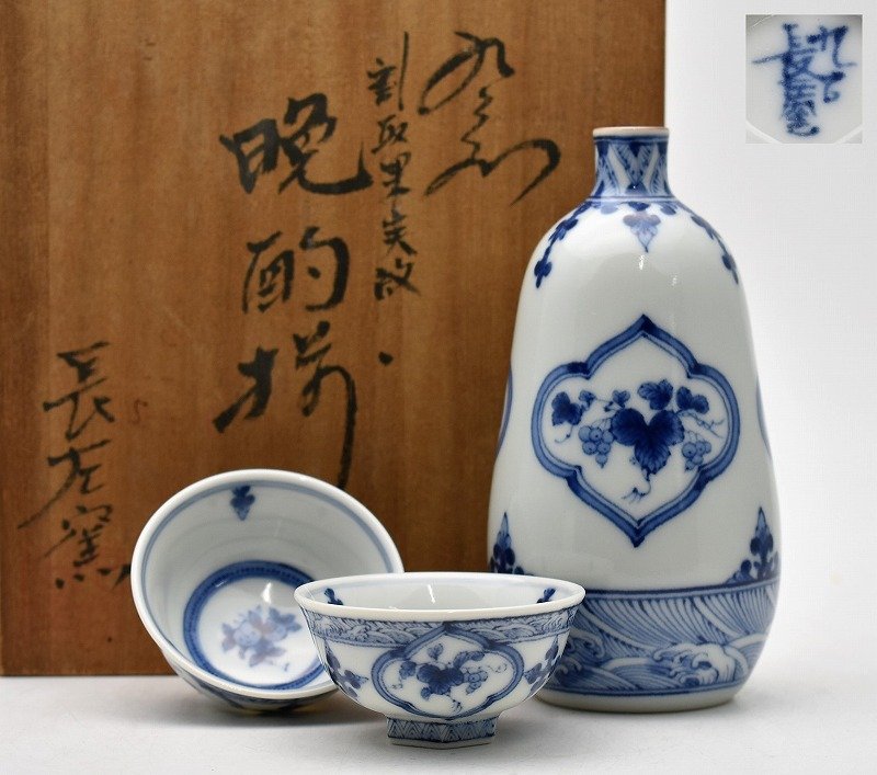 石川県小松市のお客様に出張買取にてご依頼頂き、九谷焼 妙泉陶房 長左窯 染付 割取果実紋 晩酌揃 酒器 徳利を買取りさせて頂きました。