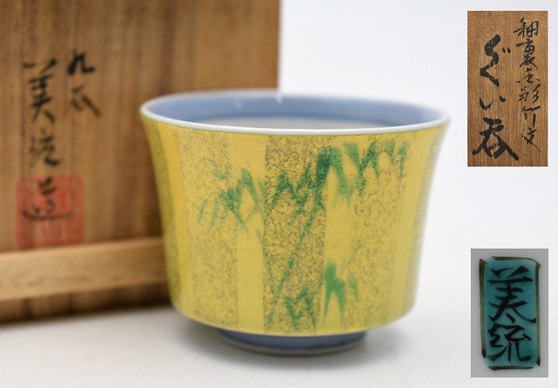 石川県能美市のお客様に出張買取にてご依頼頂き、人間国宝 九谷焼 錦山窯 三代 吉田美統 釉裏金彩竹文 ぐい呑を買取りさせて頂きました。