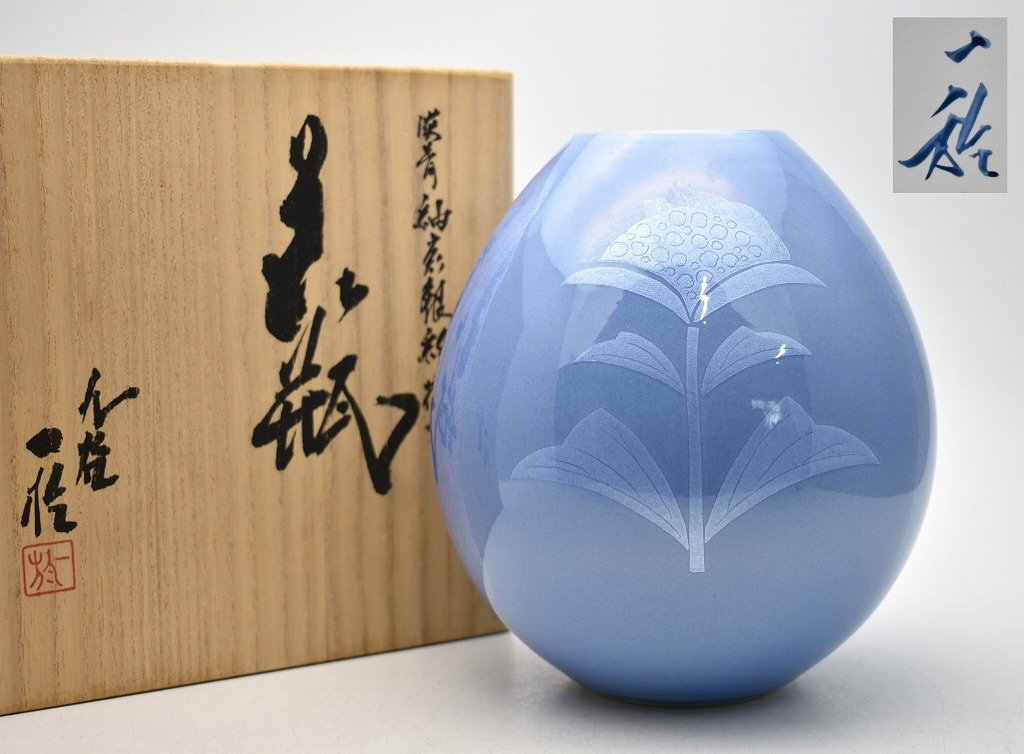 石川県金沢市のお客様に出張買取にてご依頼頂き、石川県無形文化財 九谷焼 名工 中田一於 淡青釉裏銀彩花文 花瓶を買取りさせて頂きました。
