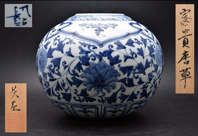 九谷焼買取 古美術買取【石川県加賀市】のお客様より◆九谷焼 妙泉陶房 山本長左 染付富貴唐草 花生◆をお買取り。