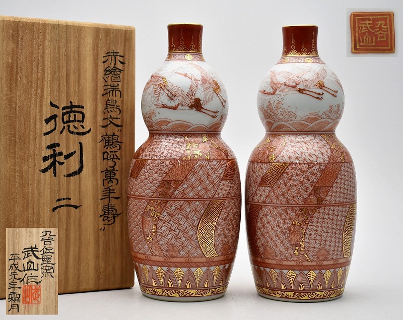 石川県能美市のお客様より出張買取にてご依頼頂き、九谷焼 佐野窯 福島武山 赤絵瑞鳥文 鶴呼萬年寿 酒器 徳利 一対を買取りさせていただきました。