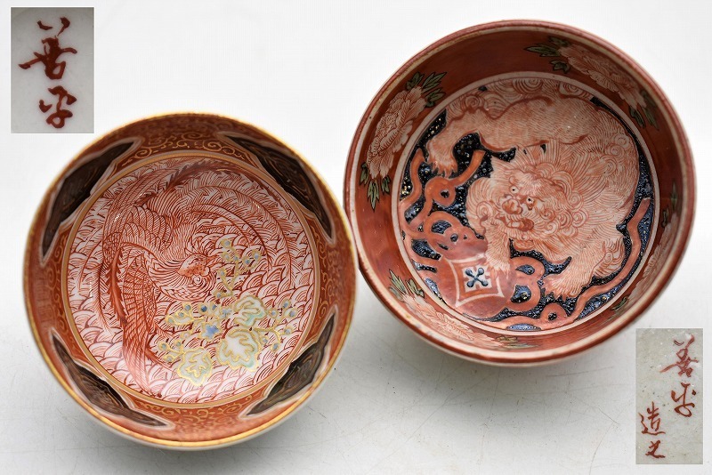 九谷焼・輪島塗 九谷焼買取 古道具・骨董・古美術 茶道具【石川県小松市】のお客様より◆九谷焼 武腰善平 赤絵細描画 獅子 鳳凰 酒器 酒盃 2客◆をお買取り。