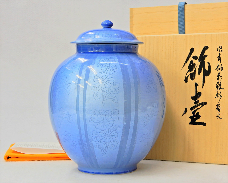 石川県小松市のお客様より出張買取にてご依頼頂き、九谷焼名工 中田一於 淡青釉裏銀彩菊文飾壷を買取りさせていただきました。