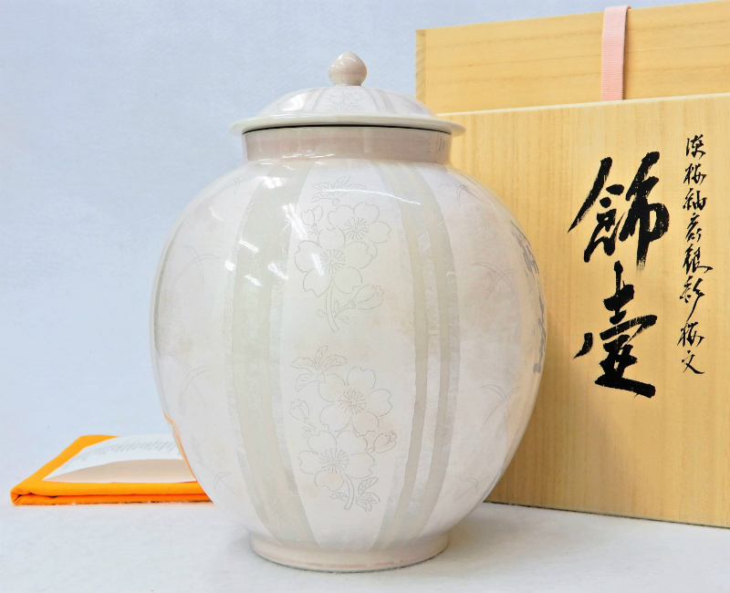未使用美品。共箱あり。他にも色違いの桜文飾壷も買取りさせていただきました。