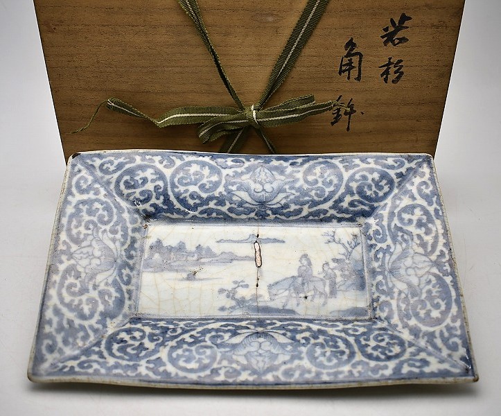 九谷焼買取 古道具・骨董・古美術【石川県加賀市】のお客様より◆時代 九谷焼若杉窯 唐草馬人物染付角皿◆をお買取り。