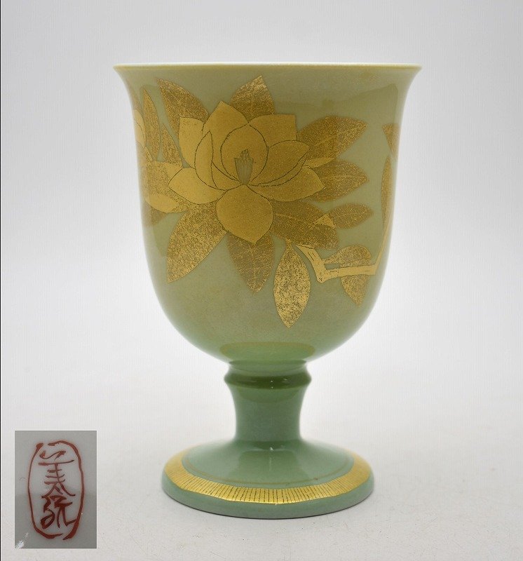 九谷焼買取 骨董品買取石川県小松市のお客様より◆人間国宝 九谷焼 吉田美統 釉裏金彩泰山木文 脚付杯 ゴブレット◆をお買取り。