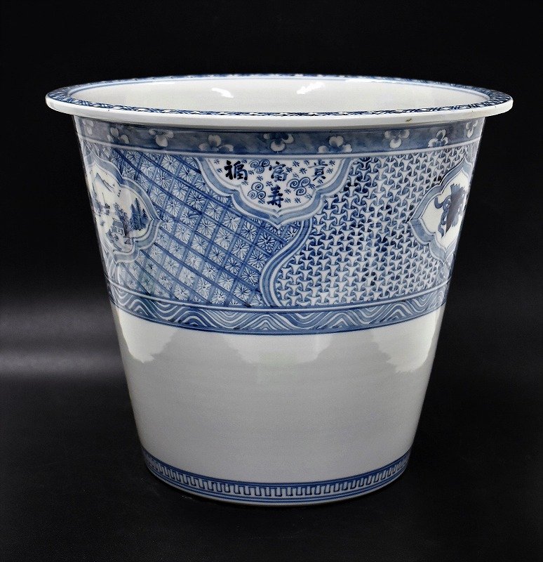 九谷焼買取【石川県小松市】のお客様より◆九谷焼 染付 窓絵山水 富貴福寿 大型 植木鉢◆をお買取り。