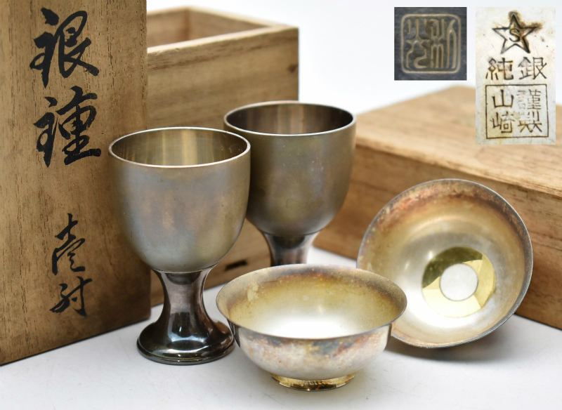 福井県福井市のお客様より出張買取にてご依頼頂き、銀製 純銀製 銀盃 4客 和光 山崎謹製 酒器 酒盃 銀杯を買取りさせていただきました。