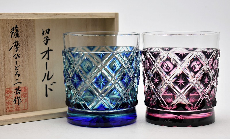 共箱あり。青被せ、紫被せペアグラス。切子作品買取アンティーク買取