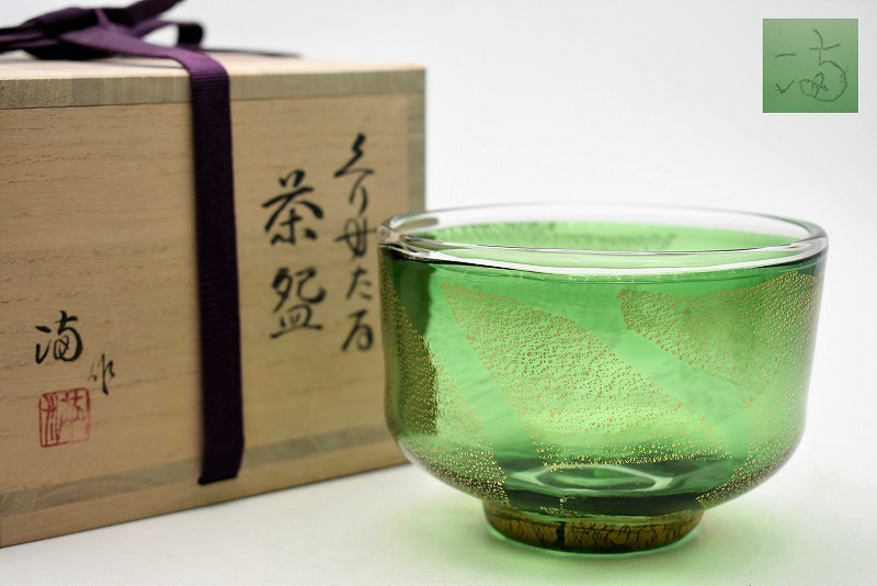 洋風アンティーク買取 茶道具買取【富山県富山市】のお客様より◆各務満 くりすたる 色硝子 碗 茶碗 茶器 共箱 金彩 緑 グリーン◆をお買取り。