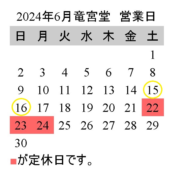 竜宮堂 竜宮の酒の令和6年6月の店舗営業日のお知らせです。