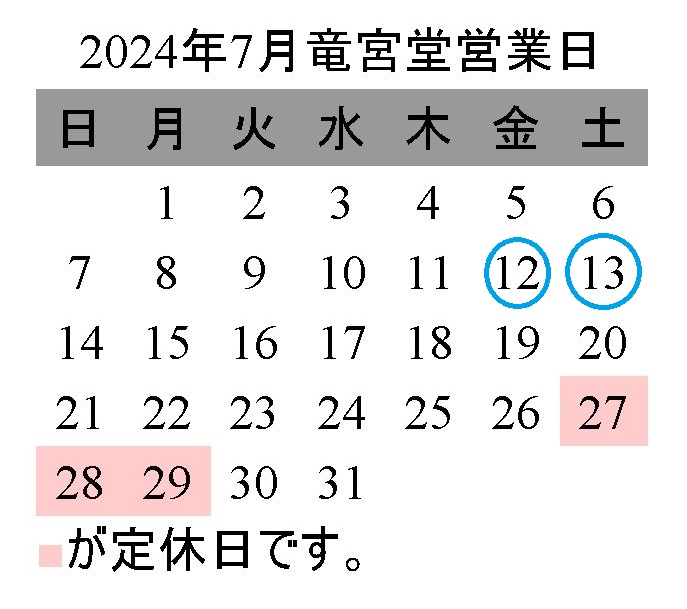 竜宮堂 竜宮の酒の令和6年7月の店舗営業日のお知らせです。