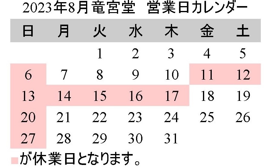 竜宮堂 令和5年8月の営業日のお知らせです。