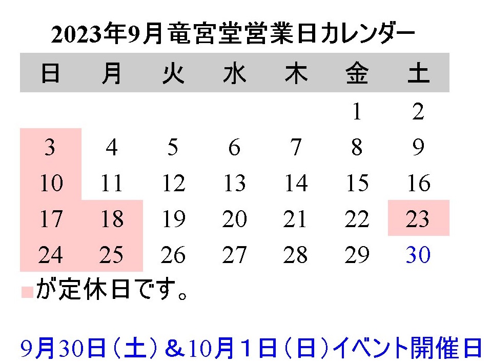 竜宮堂 令和5年9月の営業日のお知らせです。